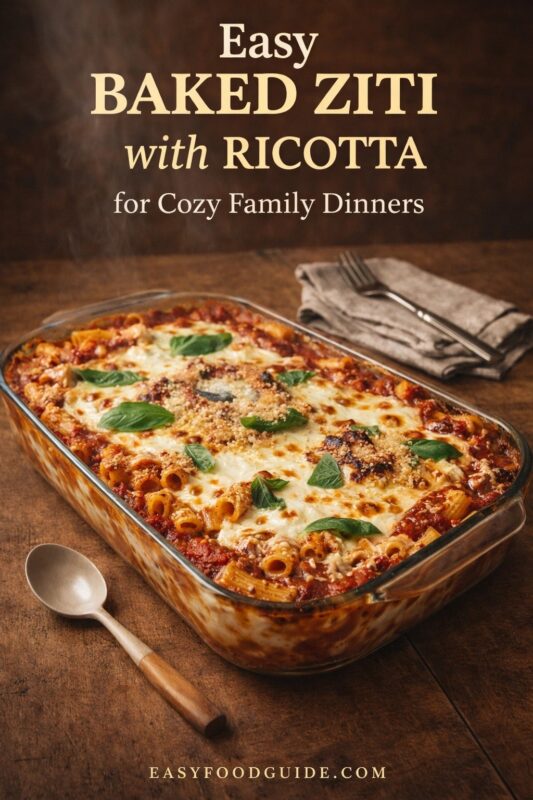 This Baked Ziti with Ricotta is a comforting, oven-baked pasta dish perfect for a weeknight dinner or family gathering. With layers of tender ziti pasta, smooth ricotta cheese, and savory tomato sauce, it’s an easy meal that delivers rich flavors and creamy textures.