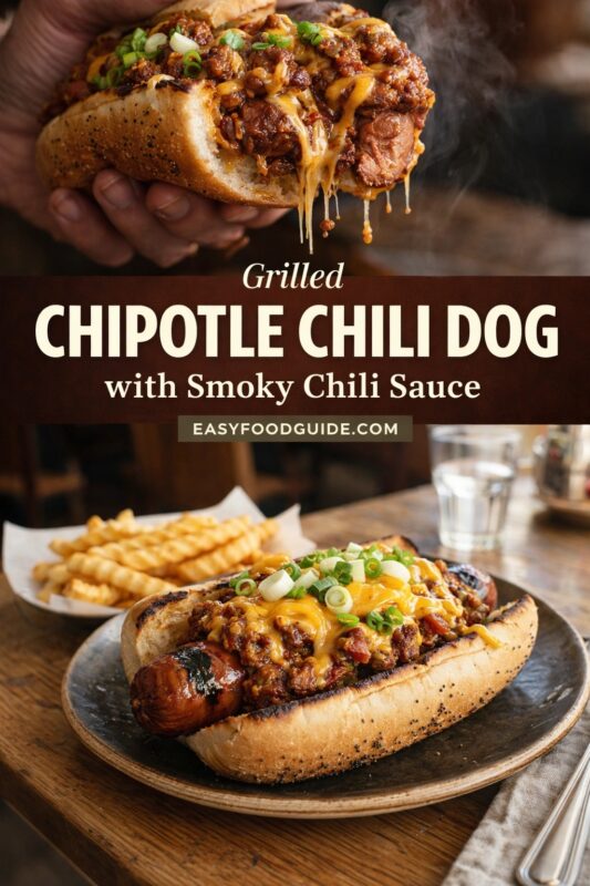 This Chipotle Chili Dog is a smoky, savory dish perfect for any cookout. Featuring a grilled beef frankfurter nestled in a toasted bun, it’s topped with a robust chipotle chili sauce, melting cheddar cheese, and fresh chopped scallions, ensuring a flavorful experience in every bite.