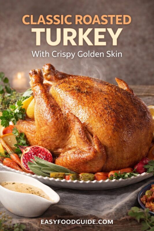 This classic roasted turkey takes about 3 to 4 hours to prepare, depending on the size, and serves 8 to 10 people. By roasting the turkey at the right temperature and basting it regularly, you achieve a moist, succulent turkey that is the centerpiece of any festive dinner.