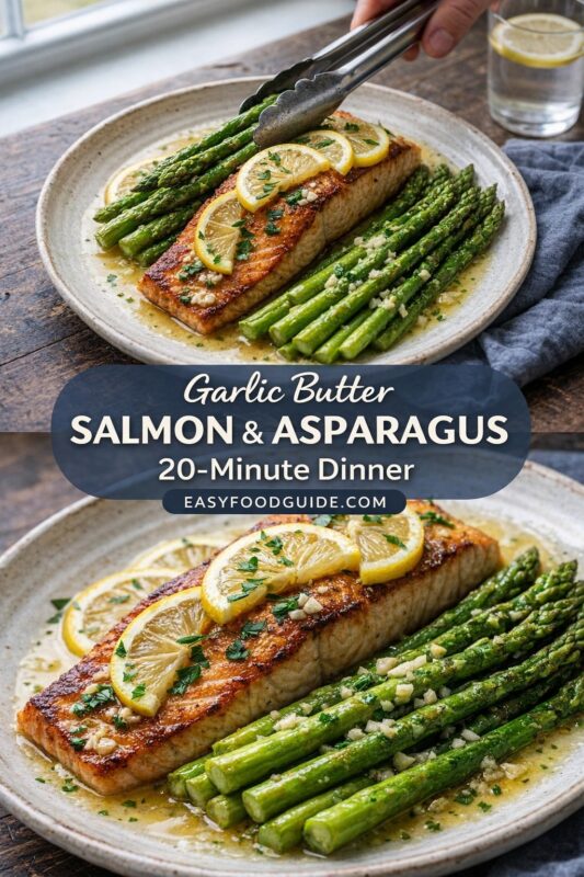 This 20-minute Garlic Butter Salmon & Asparagus is a fast and flavorful one-pan meal, making it ideal for quick weeknight dinners. Featuring juicy, flaky salmon seared to perfection alongside tender-crisp asparagus, this dish is enhanced by a rich lemon garlic butter sauce.