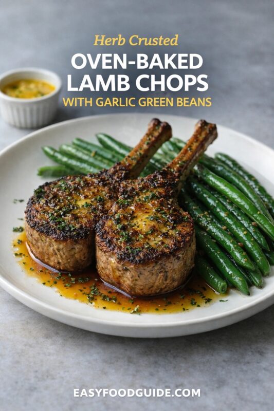 This Oven-Baked Lamb Chops with Garlic Green Beans recipe delivers a tender, herb-crusted meal in under 30 minutes. Featuring juicy oven-baked lamb chops paired with garlic-tossed green beans, this dish is perfect for a quick lamb dinner.